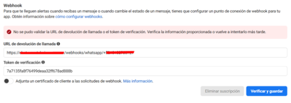 Buen día. Cree una app con un número de WhatsApp en Meta siguiendo los pasos del video recomendado. Realicé la verificación en 2 pasos y en la página de “Administrador de WhatsApp” dentro del portafolio comercial, el número de teléfono ya me aparece “Conectado”. También ya generé un token que no caduca en el portafolio comercial. Después de esto, hice la conexión dentro de Chatwoot ingresando el inbox name, phone number (+5218120053696), phone number ID, business accoun ID y el API key; hasta aquí todo bien, porque puedo guardar la conexión y me arroja la pantalla de “Your inbox is ready” con el webhook y el verification token. El problema es que al ingresar el webhook URL y el Webhook verification token en la App de Meta para poder hacer uso de Whatsapp, me arroja el error adjunto. Alguna idea de cómo solucionarlo? Gracias de antemano!